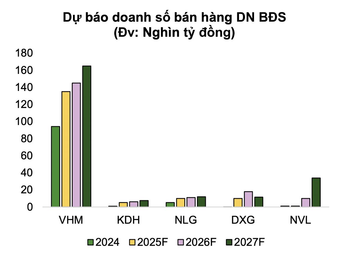 Cụ thể, năm 2026 doanh số bán hàng dự kiến tăng tập trung vào các doanh nghiệp lớn, uy tín, đang triển khai bán hàng tại các thành phố và tỉnh ven trung tâm vị trí tốt sẽ có mức hấp thụ gia tăng, có thể kể đến như VHM, KDH, NLG, DXG.