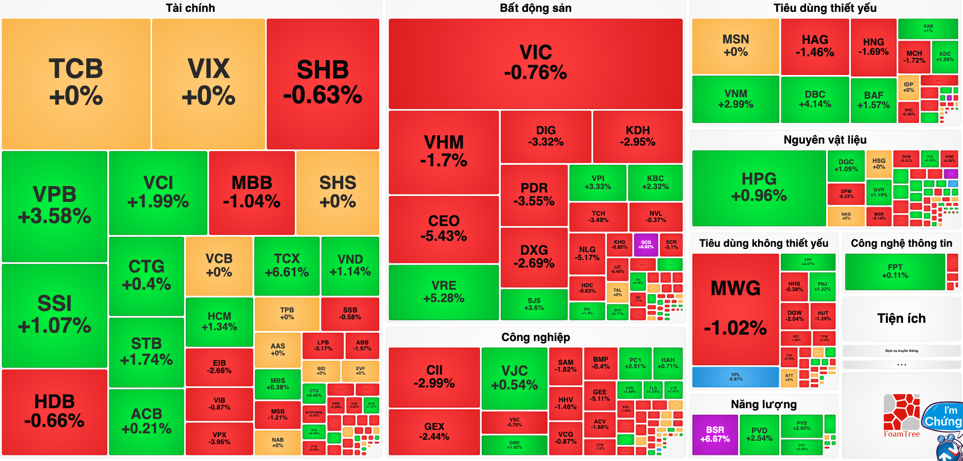 Nhóm cổ phiếu ngân hàng có sự phân hóa nhưng sắc đỏ nhiều hơn: LPB giảm 3,17%, EIB giảm 2,66%, MSB giảm 1,21%, MBB giảm 1,04%, ABB giảm 1,97%; VIB, HDB, SHB, SSB giảm gần 1%. Ngược lại: VPB tăng 3,58%, STB tăng 1,74%; ACB, CTG tăng gần 1%.