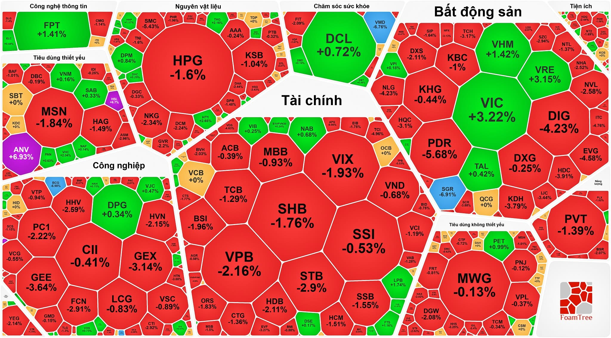 Đóng cửa phiên giao dịch, VN-Index giảm 6,89 điểm (0,42%) còn 1.645,82 điểm với đến 229 mã giảm, 85 mã tăng và 59 mã đứng giá. Chốt phiên tại sàn Hà Nội, HNX-Index cũng giảm 3,8 điểm (1,41%) còn 265,75 điểm với 107 mã giảm, 46 mã tăng và 62 mã đứng giá. Thanh khoản tăng so với phiên trước vì lực bán mạnh, tổng giá trị giao dịch trên sàn HOSE gần 24.600 tỷ đồng, tăng 1.900 tỷ đồng so với phiên trước.