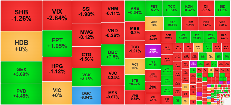 Mở rộng ra toàn sàn HoSE, độ rộng không quá chênh lệch với 114 mã tăng/206 mã giảm (chốt phiên sáng là 119 mã tăng/178 mã giảm) nhưng mặc bằng giá có thấp hơn. Cụ thể, số mã giảm quá 1% buổi sáng là 81, đến lúc đóng cửa là 115. Thêm nhiều cổ phiếu bị bán tăng cường, với 13 mã thanh khoản vượt trăm tỷ đồng. Những cổ phiếu giảm giá đáng kể là VIX giảm 2,84%, SSI giảm 1,98%, DGC giảm 6,94%, VJC giảm 3,34%, CII giảm 3,3%, VNM giảm 2,02%, DXG giảm 2,32%. Thống kê sàn này lúc đóng cửa cũng có hơn 46% số cổ phiếu chốt giá thấp nhất hoặc chỉ chênh 1 bước giá kỹ thuật. Thanh khoản phiên chiều ghi nhận tăng 20% so với phiên sáng.