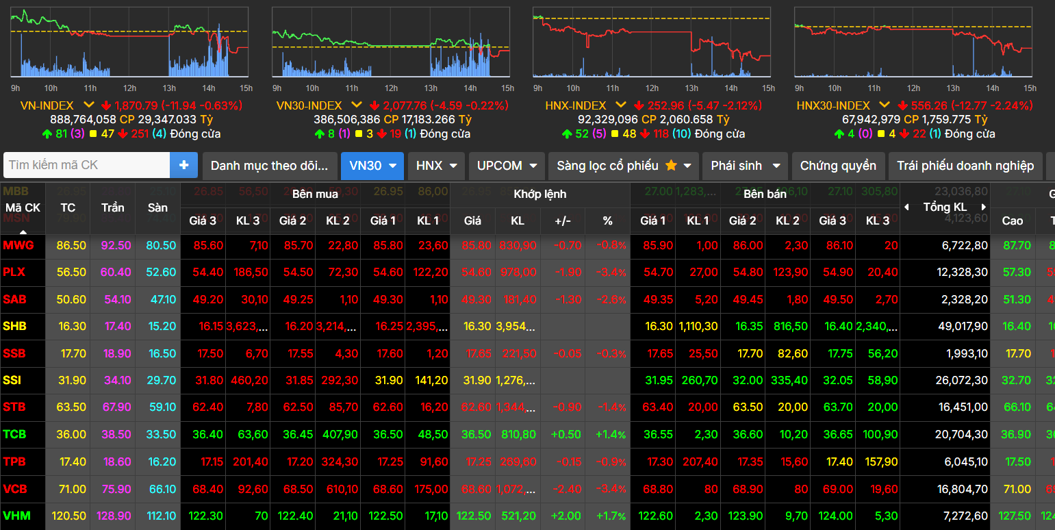 Sắc đỏ chiếm áp đảo trên bảng giao dịch điện tử với 81 mã đi lên, có tới 251 mã đi xuống. Tại rổ VN30, số mã giảm giá nhiều gấp 2 lần số mã tăng giá (19 mã và 8 mã).
