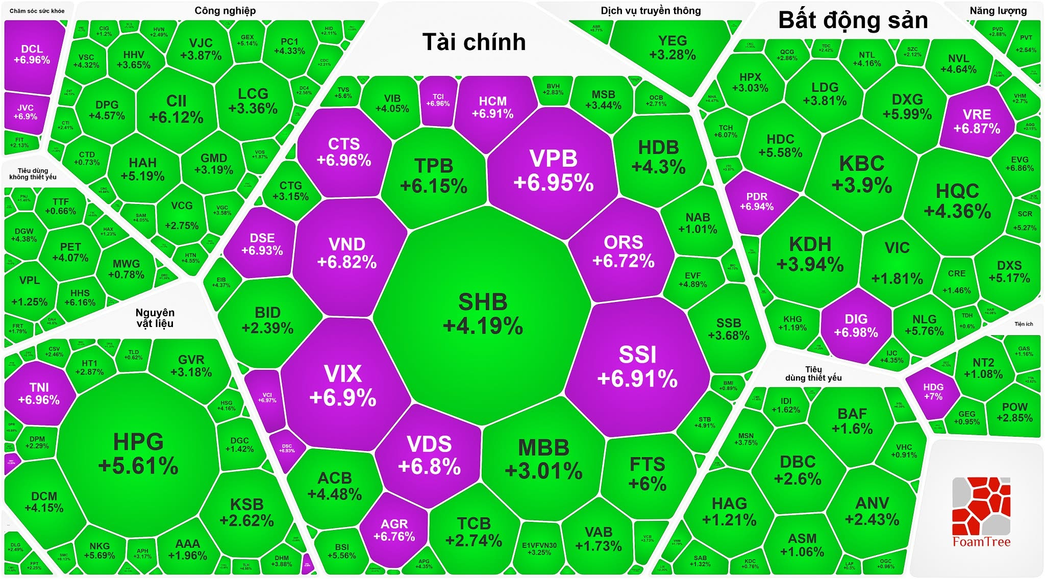 Thị trường chứng khoán phiên ngày 6-10 đã bất ngờ tăng gần 50 điểm ngay trước "giờ G" nhờ dòng tiền đổ vào mua cổ phiếu. Nhóm cổ phiếu "hoa tiêu thị trường" bùng nổ đã tạo hiệu ứng lan tỏa, sắc tím (cổ phiếu tăng trần) lan khắp các nhóm ngành, cho thấy nhà đầu tư đang đặt cược rất cao vào kỳ vọng nâng hạng thị trường.