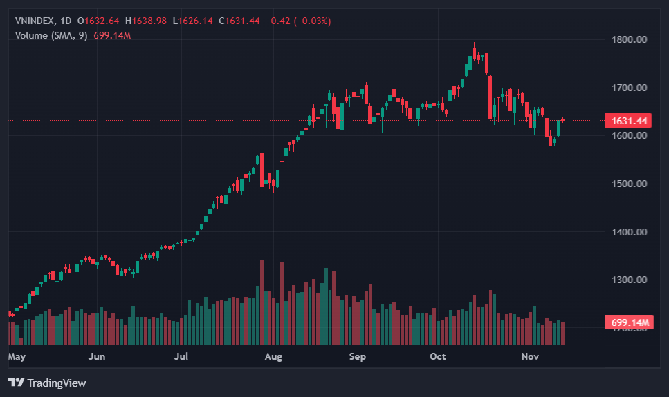 Kết thúc ngày giao dịch, VN-Index giảm nhẹ 0,42 điểm (-0,1%) còn 1.631,44 điểm, trong khi HNX-Index tăng 1,5 điểm (+0,6%) lên 266,29 điểm và UPCoM-Index tăng 1,01 điểm (+0,9%) lên 120,04 điểm.