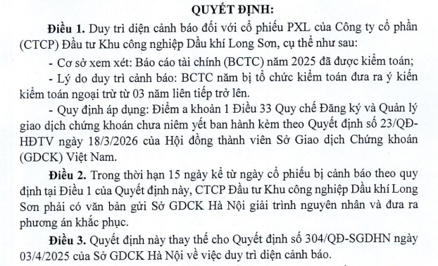 Lý do duy trì cảnh báo mà HNX đưa ra là do Báo cáo tài chính năm 2025 của Long Sơn PIC có ý kiến ngoại trừ từ 3 năm liên tiếp trở lên.