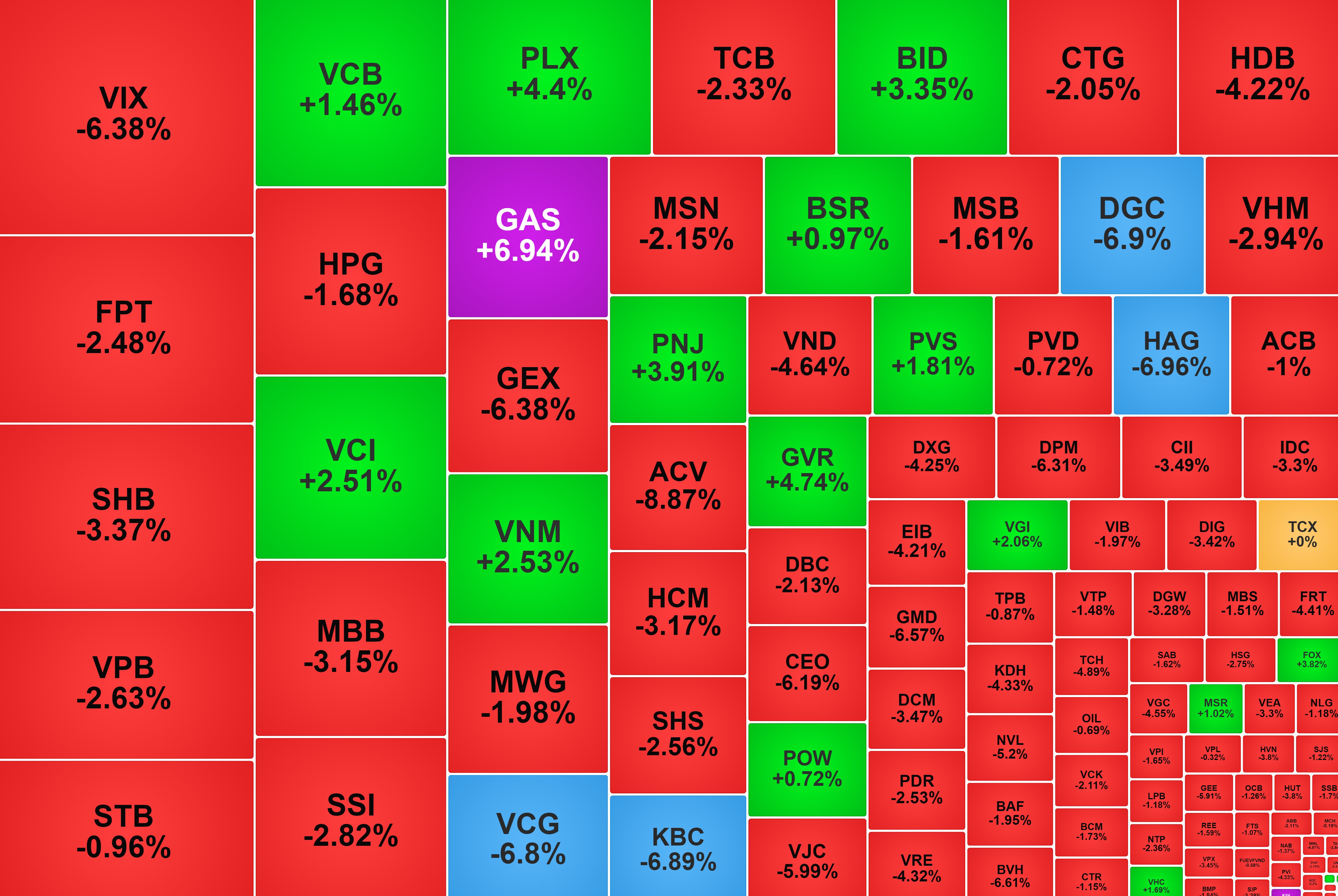 Nhóm xây dựng có VCG giảm sàn, CII -3,5%, HHV -3,2%, LCG -3,4%, FCN -4,2%... Nhóm cảng, vận tải biển có VSC giảm sàn, ACV -8,9%, GMD -6,6%, HAH -2,4%, HVN -3,8%, VOS -6,4%... Nhóm bán lẻ có MWG -3%, FRT -4,4%, DGW -3,3%, PET giảm sàn… Bộ đôi nhóm Gelex giảm sâu: GEX -6,4%, GEE -5,9%.