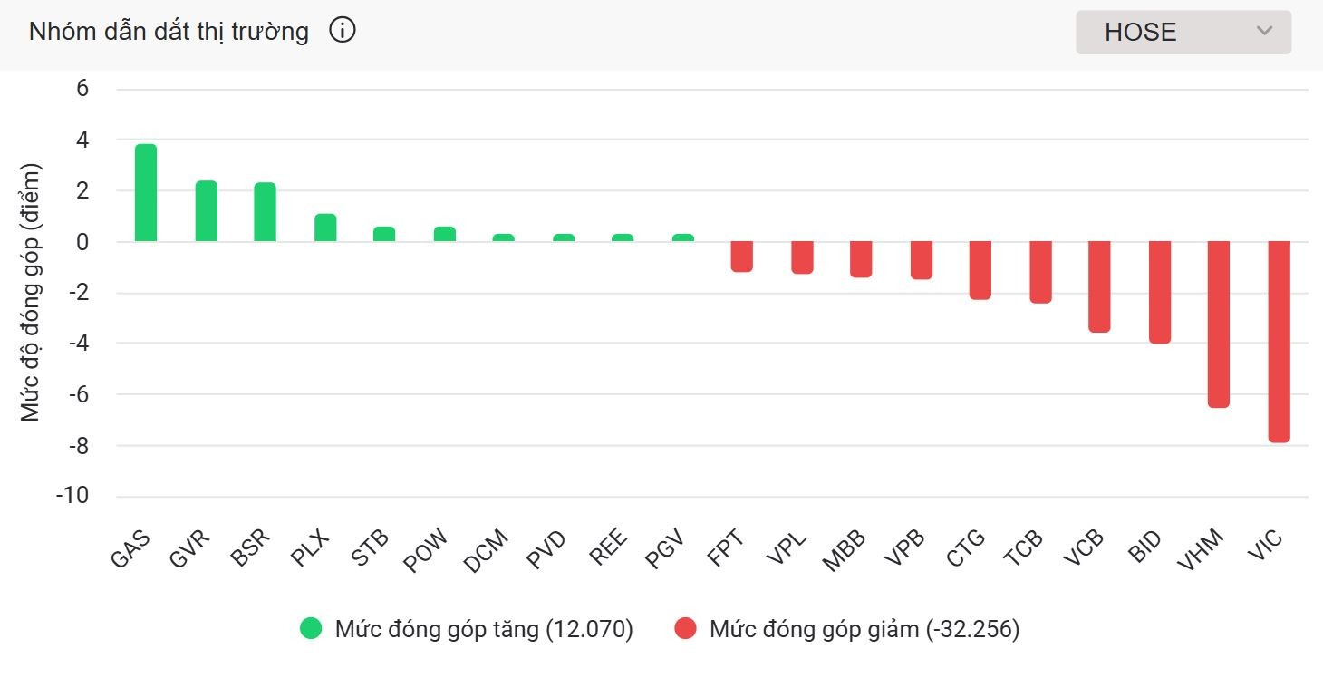 Trái ngược hoàn toàn với diễn biến tích cực của dầu khí và vận tải biển, cổ phiếu bất động sản giảm mạnh và trở thành nguyên nhân chính khiến chỉ số lao dốc. VIC – cổ phiếu có vốn hóa lớn nhất thị trường – dù hồi phục trong phiên sáng nhưng chốt phiên vẫn giảm 2,8% xuống 167.200 đồng/cp, lấy đi 7,9 điểm của VN-Index. VHM giảm kịch biên độ, “trắng bên mua”, khiến chỉ số mất thêm 6,6 điểm. Nhiều mã lớn khác trong ngành giảm từ 4–7% như TCH, VRE, DXS, PDR, NLG, KSF, NVL, DIG, HDC.