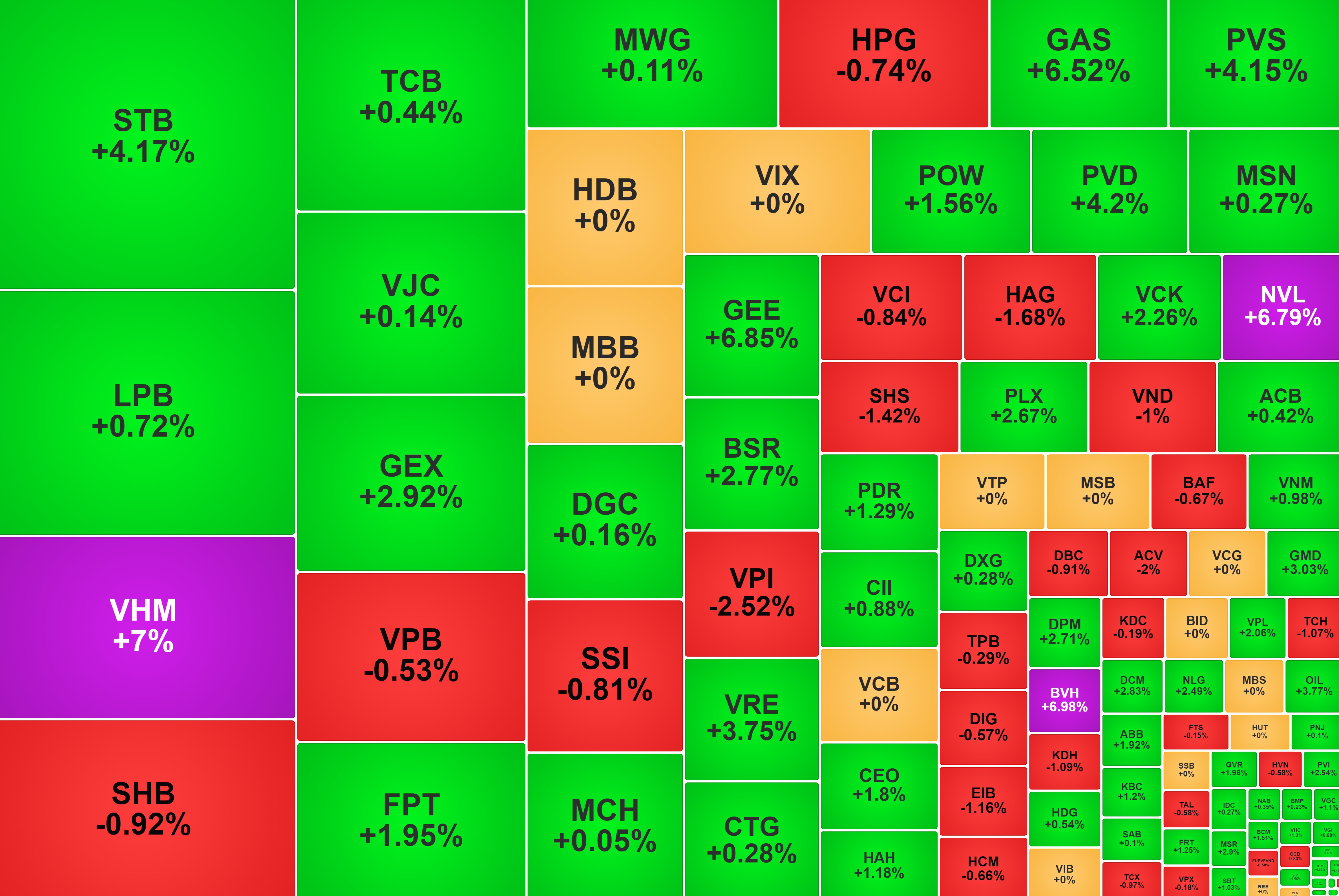 Ngoài nhóm Vingroup, dòng tiền hôm nay còn hướng tới nhóm dầu khí, với GAS +6,5%, PVS +4,2%, PVD +4,2%, BSR +2,8%, PLX +2,7%, PVT +2,4%, OIL +3,8%, PVC +7,3%, PVB tăng trần…