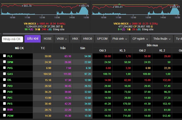Trong bối cảnh áp lực bán dâng cao thì nhóm cổ phiếu ngành dầu khí lại đi ngược thị trường với việc đồng loạt xanh, tím.