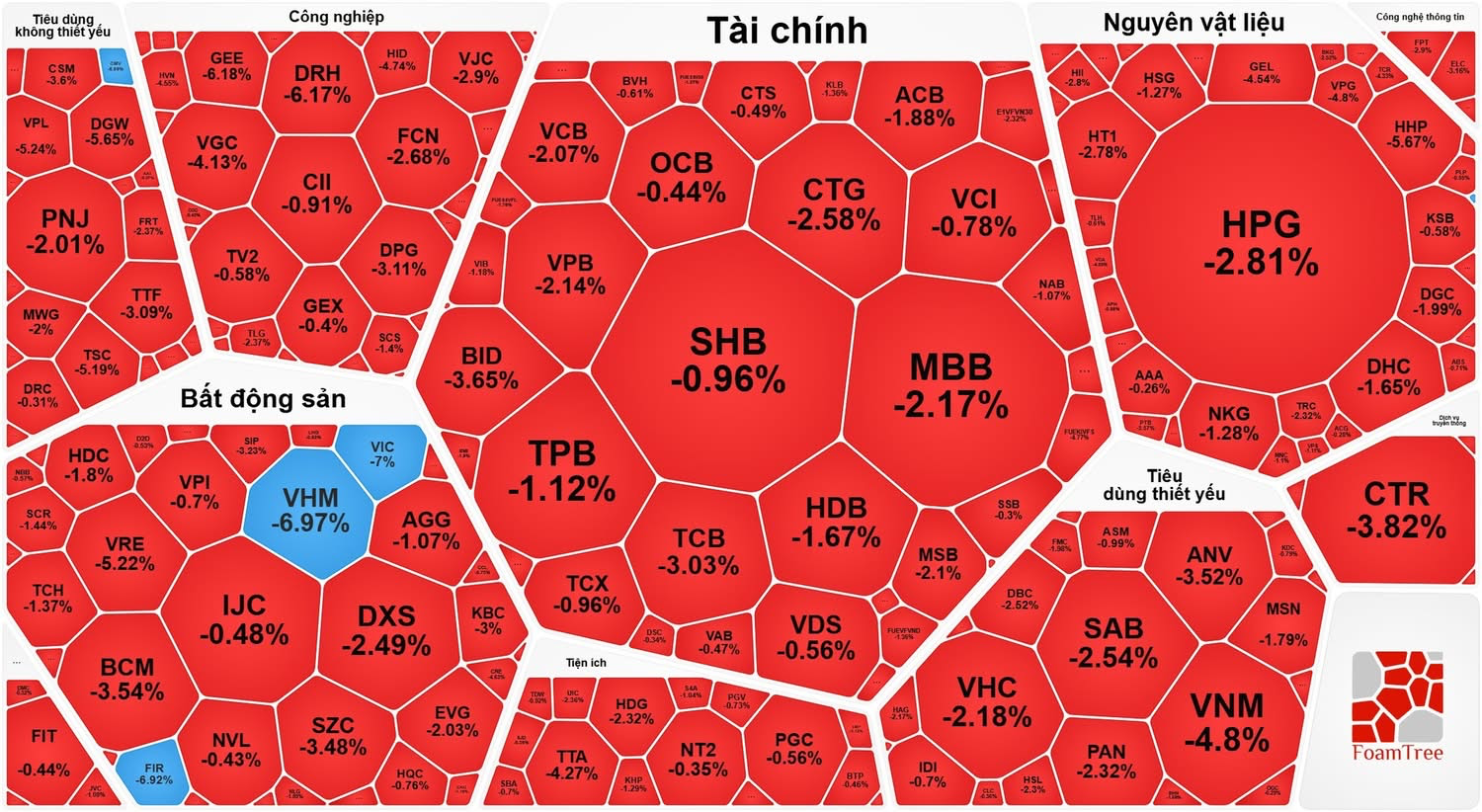 Bên cạnh đó, nhóm cổ phiếu ngân hàng cũng giảm mạnh góp phần kéo VN-Index “rơi” mạnh: TCB giảm 3,03%, CTG giảm 2,58%, MBB giảm 2,17%, BID giảm 3,65%, VCB giảm 2,07%, VPB giảm 2,14%, ACB giảm 1,88%, HDB giảm 1,67%...