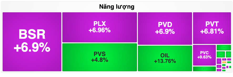Riêng nhóm cổ phiếu năng lượng, đặc biệt là nhóm dầu khí vẫn đi ngược thị trường, tiếp tục tăng trần hàng loạt: BSR, PLX, PVD, PVT, PVC, GAS, POW…