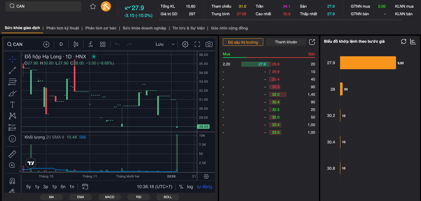 Trong phiên chứng khoán sáng nay (8/1), cổ phiếu CAN của Công ty CP Đồ hộp Hạ Long lao dốc, giảm 10% về mức giá sàn 27.900 đồng/đơn vị.