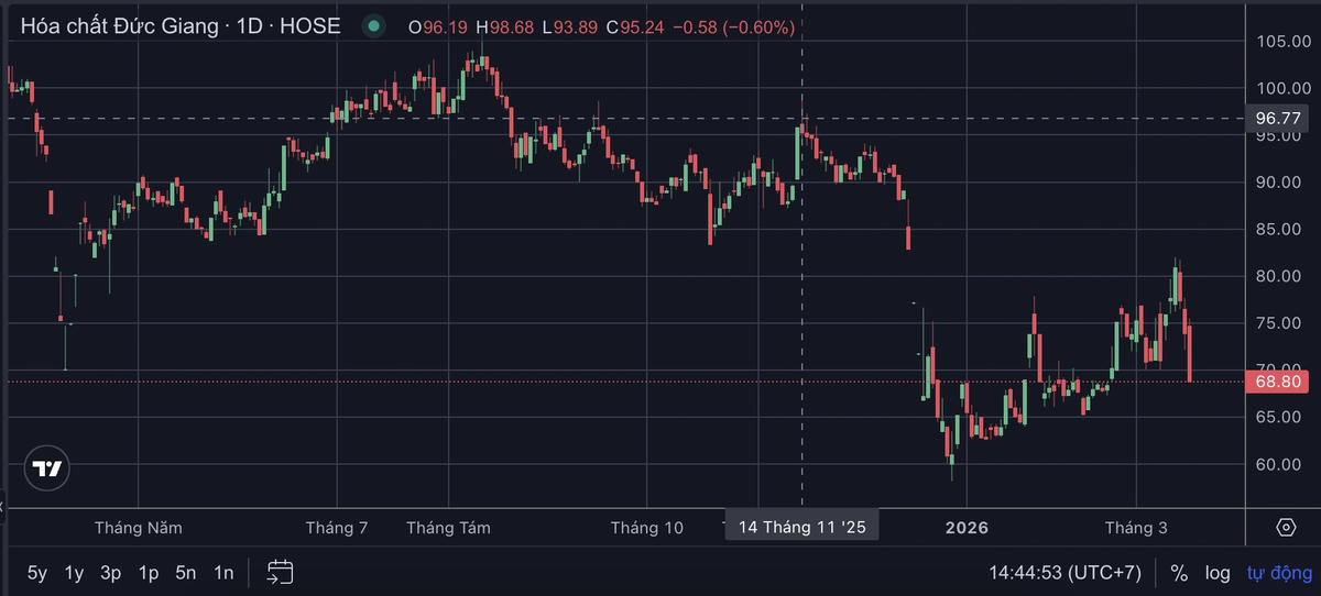 Trước đó, cổ phiếu DGC từng ghi nhận nhịp hồi phục hơn 30% từ vùng đáy cuối năm 2025, song đã quay đầu giảm mạnh trong những phiên gần đây.
