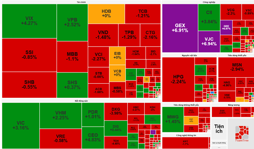Trái ngược với nhóm tài chính, nhóm công nghiệp và hàng không trở thành tâm điểm tích cực của phiên. GEX tăng mạnh 6,91%, còn VJC tăng trần góp phần nâng đỡ thị trường chung. CII (+3,84%) cũng là điểm sáng, thu hút dòng tiền đầu cơ mạnh mẽ.