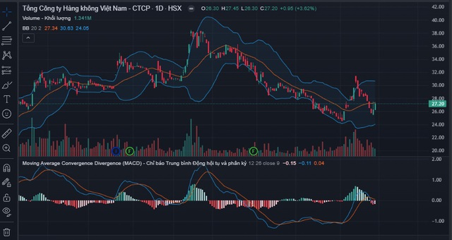 Trên biểu đồ kỹ thuật, 3 chỉ báo BB, MACD và RSI đều cho tín hiệu tích cực đối với HVN. Với chỉ báo BB, đường giá chưa chạm đến biên dưới do gặp sức mạnh từ dòng tiền nhập cuộc, cây nến thứ hai chạm đến đường MA20 trong khi hai biên thu hẹp, cho tín hiệu tăng trưởng.