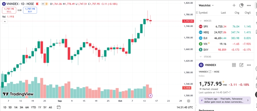 Kết phiên 15/10 VN-Index giảm 3,11 điểm, tương đương 0,18% xuống mốc 1.757,95 điểm. Ngược chiều, Hnx-Index tăng 0,79 điểm, tương đương 0,29% lên 276,12 điểm.