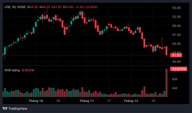 Kết phiên, cổ phiếu LPB giảm 5% so với tham chiếu, xuống còn 41.800 đồng/cổ phiếu, thanh khoản tăng đột biến với hơn 12,6 triệu cổ phiếu được sang tay, cao gấp gần 5 lần so với phiên liền trước. Tại thời điểm đóng cửa, mã này ghi nhận dư mua gần 647.000 cổ phiếu, trong khi dư bán chỉ hơn 42.000 đơn vị.