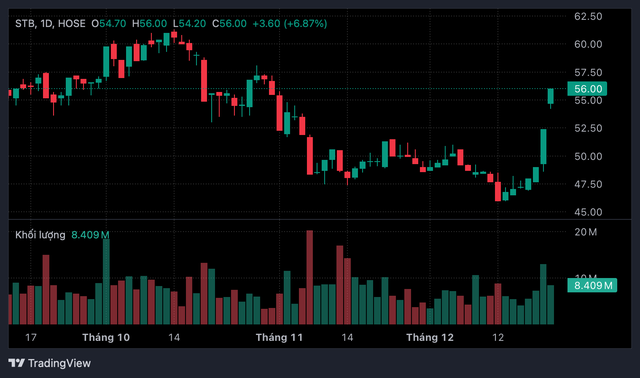 Trái ngược với diễn biến của LPB, cổ phiếu STB của Sacombank tiếp tục gây chú ý khi tăng kịch trần lên 56.000 đồng/cổ phiếu. Mã này trắng bên bán và dư mua hơn 9,1 triệu cổ phiếu, đánh dấu phiên tăng trần thứ hai liên tiếp. Thanh khoản đạt hơn 8,4 triệu đơn vị, dù giảm so với phiên trước nhưng vẫn cao hơn mức trung bình gần đây.
