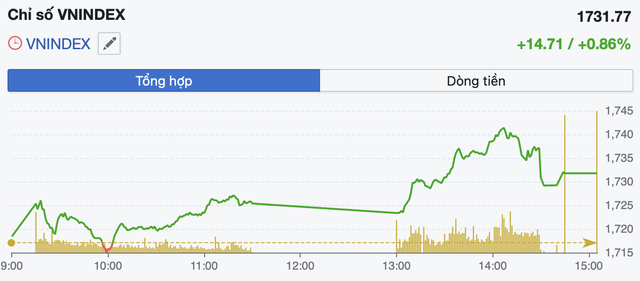 Đây cũng là động lực chính giúp VN-Index có lúc tăng hơn 20 điểm và đóng cửa ở mức 1.731,77 điểm, tăng 14,71 điểm so với phiên trước. Toàn thị trường ghi nhận hơn 460 mã tăng giá, trong đó có 35 mã tăng trần.