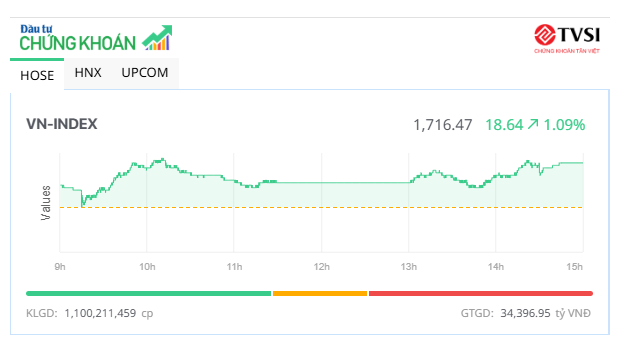 Chốt phiên, VN-Index tăng 18,64 điểm (+1,1%) lên 1.716,47 điểm với 157 mã tăng và 146 mã giảm. Tổng khối lượng giao dịch đạt hơn 1,1 tỷ đơn vị, giá trị 34.396 tỷ đồng, đều tăng hơn 3% cả về khối lượng và giá trị so với phiên hôm qua. Trong đó, giao dịch thỏa thuận đóng góp 59,6 triệu đơn vị, giá trị 2.653,3 tỷ đồng.