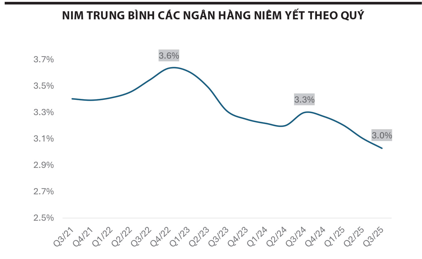 NIM tiếp tục xu hướng giảm dần trong 3 quý liên tiếp tại hầu hết các ngân hàng, trung bình ngành giảm từ 3,2% trong quý I, xuống lần lượt 3,1% và 3% trong quý II và III/2025 - cũng là mức thấp nhất của ngành kể từ năm 2020 trở lại đây.