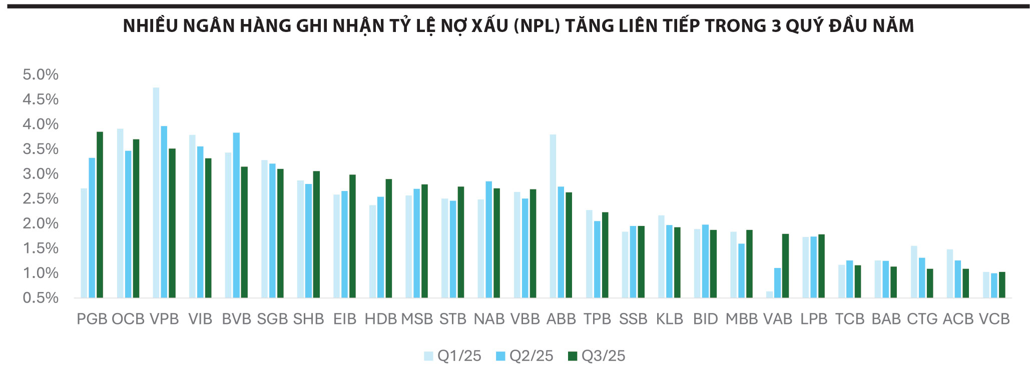 Khi tín dụng có nhiều dư địa để tăng trưởng, chất lượng tài sản là yếu tố cần quan tâm hàng đầu của ngành ngân hàng hiện nay. Tỷ lệ nợ xấu (NPL) trung bình của các ngân hàng niêm yết tăng nhẹ lên mức 2,39% trong quý III/2025, từ mức 2,35% trong quý trước đó. Nhiều ngân hàng ghi nhận tỷ lệ nợ xấu tăng liên tiếp trong 3 quý đầu năm. Bên cạnh đó, tỷ lệ bao phủ nợ xấu (LLR) - một trong những chỉ số quan trọng đánh giá chất lượng tài sản, không có sự cải thiện. Chúng tôi ước tính, LLR trung bình của các ngân hàng niêm yết hiện ở mức 73%, tức là thấp hơn so với mức 78% cuối năm 2024 và 87% cuối năm 2023. Đáng chú ý, tỷ lệ LLR của một vài ngân hàng đã rơi xuống mức dưới 40%, đây là điều đáng lo ngại khi dư nợ cho vay dự kiến tiếp tục mở rộng trong những tháng tới.