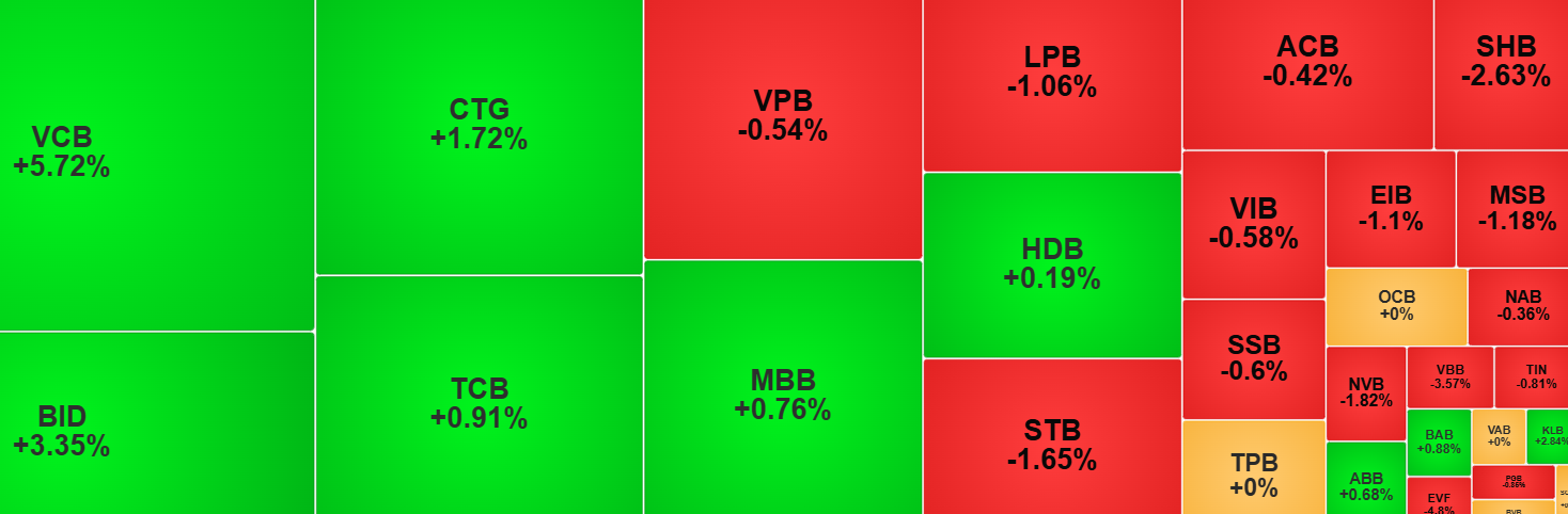 Nhóm cổ phiếu ngân hàng hỗ trợ thị trường. Ảnh chụp qua màn hình. Ảnh: PV