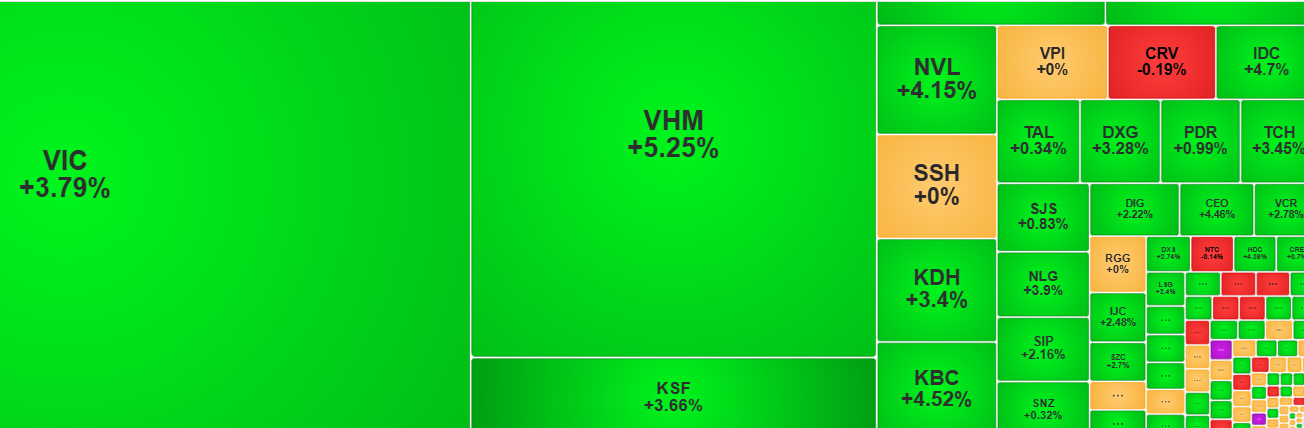 VN-Index tăng điểm trên diện rộng với sự dẫn dắt của nhóm cổ phiếu lớn, đặc biệt là cổ phiếu nhà Vin.