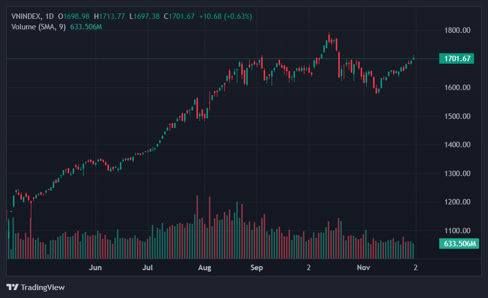 VN-Index trở lại mốc tâm lý 1.700 điểm nhưng thị trường vẫn chưa sôi động trở lại. Ảnh: TradingView.