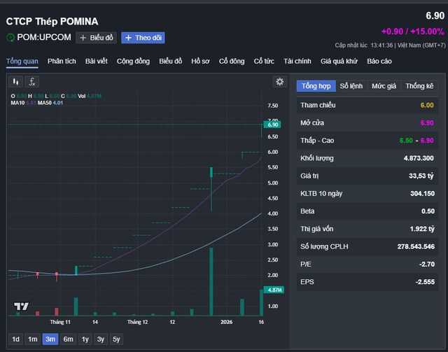 Đến sáng 16/1/2026, cổ phiếu POM tiếp tục tăng trần lên6.900 đồng/cổ phiếu Tạm tính theo giá này, Thép Việt có thể sẽ thu về khoảng 52tỷ đồng từ số cổ phiếu trên.