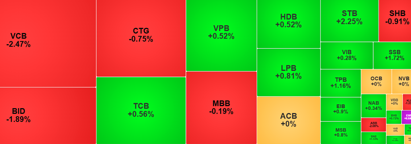 Trong khi đó, mã có vốn hóa lớn nhất thị trường là VIC giữ sắc xanh nhưng mức tăng không mạnh, chỉ đóng góp 0,99 điểm vào chỉ số; STB đóng góp 0,58 điểm. Các mã khác như GVR, DGC, MWG, BVH, TCB, VRE, DCM, VNM đóng góp dưới 0,5 điểm.