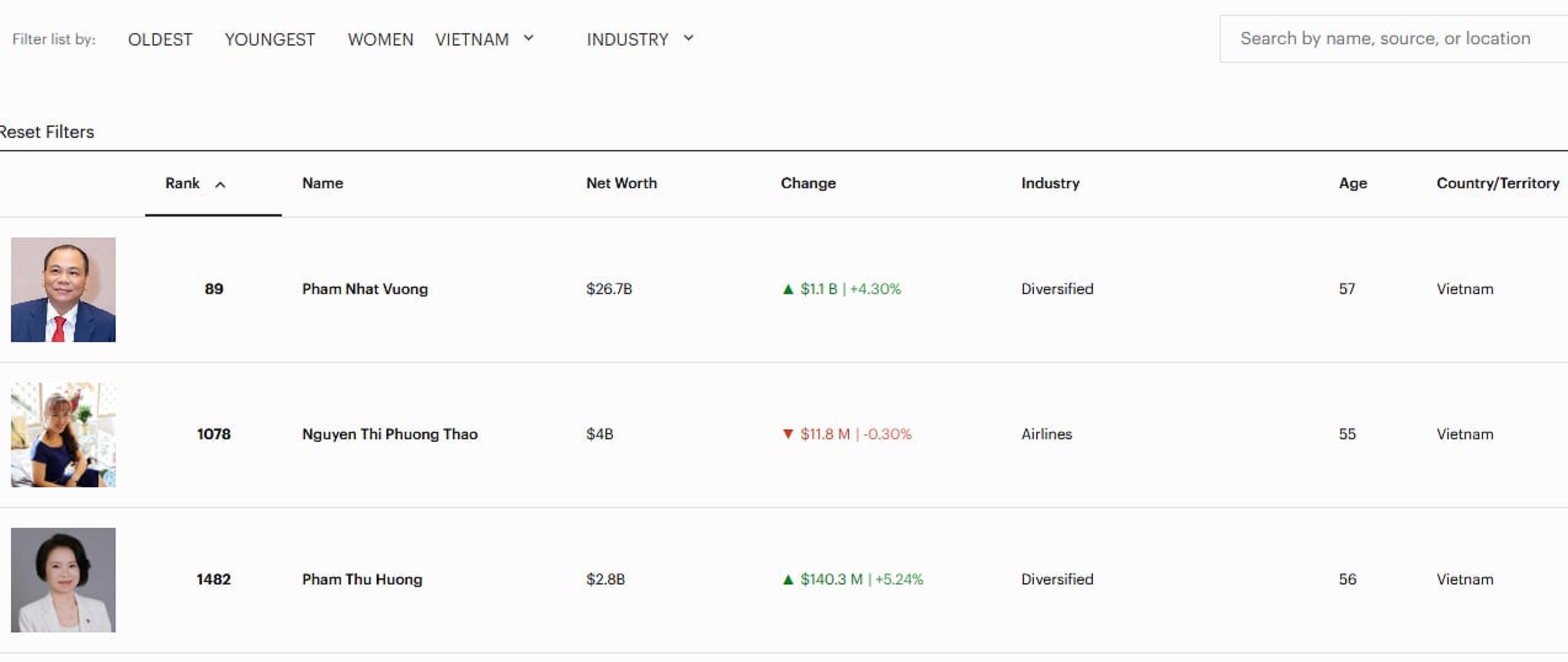 Trong nhóm các tỷ phú USD của Việt Nam theo xếp hạng của Forbes, đứng sau tỷ phú Phạm Nhật Vượng là bà Nguyễn Thị Phương Thảo - Chủ tịch HĐQT VietJet Air - với khối tài sản 4 tỷ USD. Hiện bà Nguyễn Thị Phương Thảo xếp thứ 1.078 thế giới, tiếp tục là nữ tỷ phú giàu nhất Việt Nam.