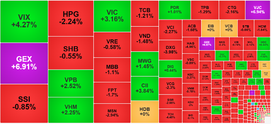 Ở phía tăng giá, tuy sức mạnh có yếu đi so với buổi sáng nhưng dòng tiền vẫn đủ khỏe để đỡ giá nhiều mã. GEX, VJC, GEE, EVG đóng cửa ở giá trần, thanh khoản khá cao. Đặc biệt GEX khớp gần 2,927 tỷ đồng bất chấp nhiều lần trong buổi chiều bị bên bán xả “bung” lượng dư mua giá cao nhất. VIX bị ép khá mạnh, có lúc chỉ còn tăng 1,7% so với tham chiếu nhưng sau đó phục hồi. Chốt phiên VIX tăng 4,27%, thanh khoản 2.995 tỷ đồng và riêng chiều nay giao dịch 884 tỷ đồng. Ngoài VIC, VHM, VPB, có thêm MWG tăng 1,45% khớp 1.015,2 tỷ; CII tăng 3,84% với 1.005,6 tỷ. Toàn sàn HoSE đóng cửa với 47 cổ phiếu tăng hơn 1% nhưng giao dịch chỉ dồn vào 20 mã với thanh khoản từ 10 tỷ trở lên.