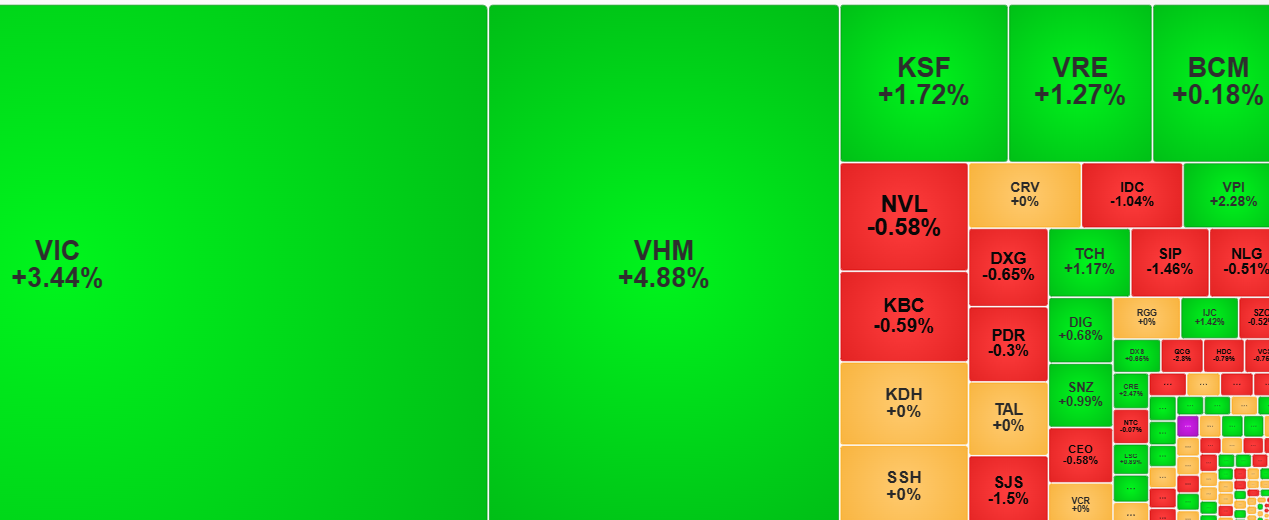 Hai mã vốn hóa lớn nhất, nhì thị trường là VIC và VHM tiếp tục nâng đỡ chỉ số khi đóng góp lần lượt 9,3 điểm và 5,46 điểm cho VN-Index.
