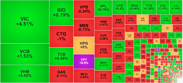 Tuy nhiên tác động từ nhóm trụ vẫn là quan trọng nhất. Tất cả các cổ phiếu vốn hóa lớn nhất của chỉ số này đều bị ép xuống, thậm chí là khá rộng. VIC đóng cửa tăng 4,51%, VHM tăng 3,42% là hai trụ đỡ toàn bộ điểm số tăng của VN-Index thì đều đã suy yếu: VIC trượt giảm tới 1,9% so với giá cao nhất và VHM trượt giảm 2,13%. Ngoài FPT chốt giá kịch trần thì VCB cũng phải trả lại tới 3,95% so với mức đỉnh, còn tăng 1,53%. CTG thậm chí trượt giảm 4,69% và đảo chiều thành giảm 1% so với tham chiếu. GAS không kém, đảo chiều -6,9% thành giảm 3,11% lúc đóng cửa. STB, cổ phiếu ngân hàng duy nhất còn đáng kể sau VCB, tăng 1,04%, thì thực tế cũng đã bị trượt giảm 3,63% trong ngày.