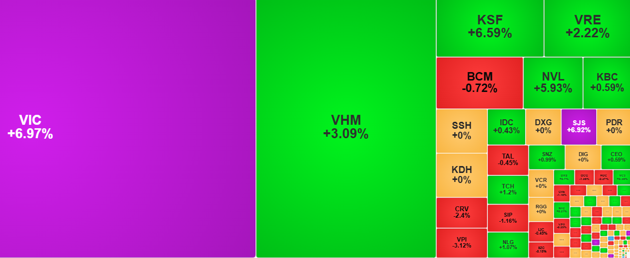 Nhóm cổ phiếu Vingroup hỗ trợ mạnh cho thị trường. Riêng VIC - mã có vốn hóa lớn nhất thị trường - tăng trần, đóng góp 23,47 điểm vào VN-Index, gần tương đương toàn bộ mức tăng của chỉ số trong phiên. Ngoài ra, VHM đóng góp 4,01 điểm và VRE đóng góp 0,32 điểm.