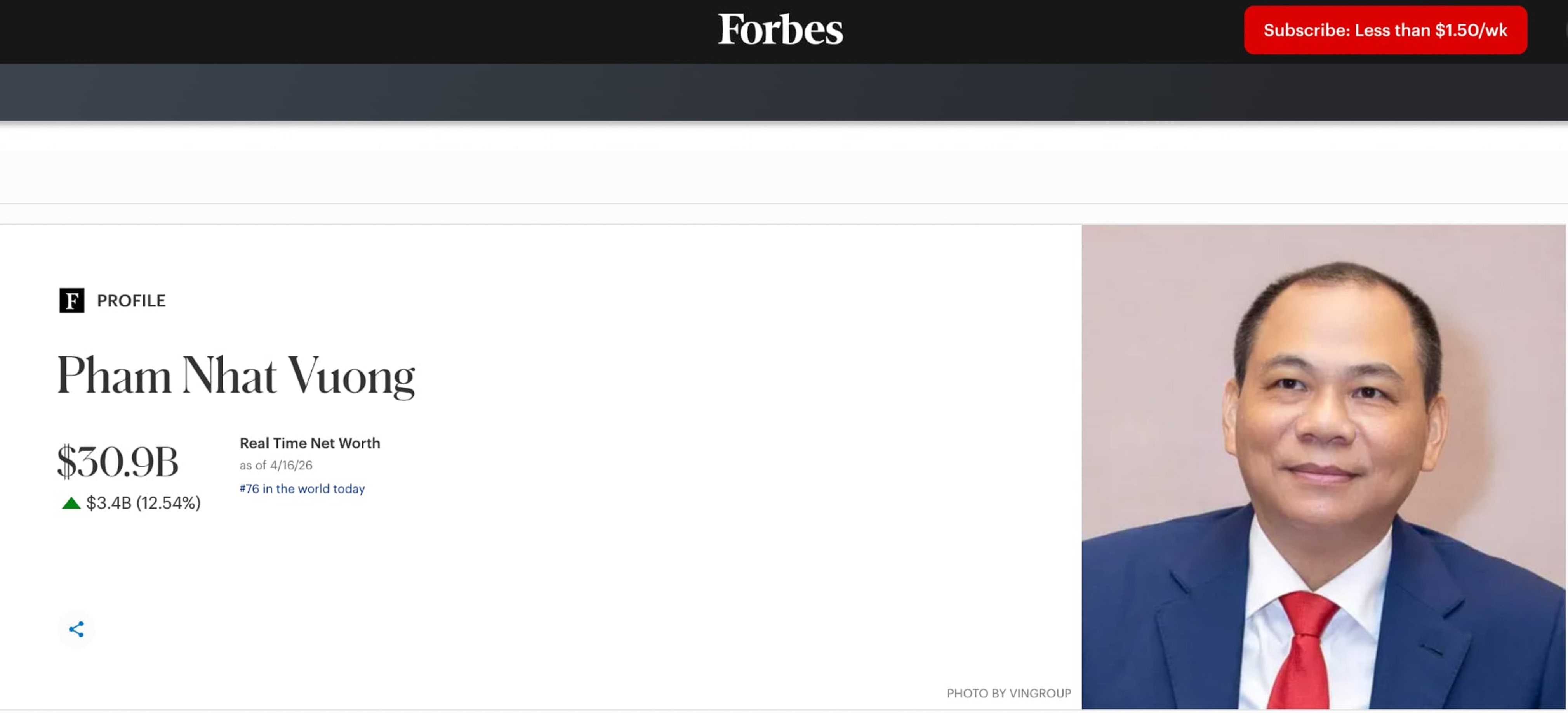 Tài sản tỷ phú Phạm Nhật Vượng lập kỷ lục hơn 30 tỷ USD. (Ảnh chụp màn hình)