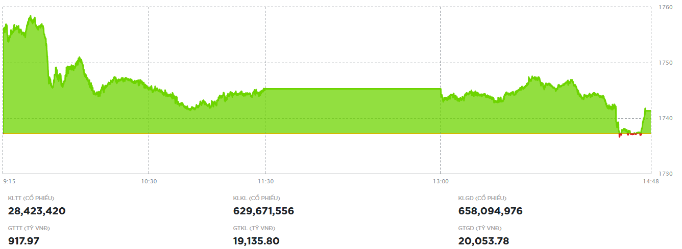 Chốt phiên, sàn HOSE có 101 mã tăng và 211 mã giảm, VN-Index tăng 4,08 điểm (+0,23%), lên 1.741,32 điểm. Tổng khối lượng giao dịch đạt hơn 658 triệu đơn vị, giá trị 20.053,7 tỷ đồng, giảm 26% về khối lượng và 24% về giá trị so với phiên hôm qua. Giao dịch thỏa thuận đóng góp hơn 28,7 triệu đơn vị, giá trị 930,3 tỷ đồng.