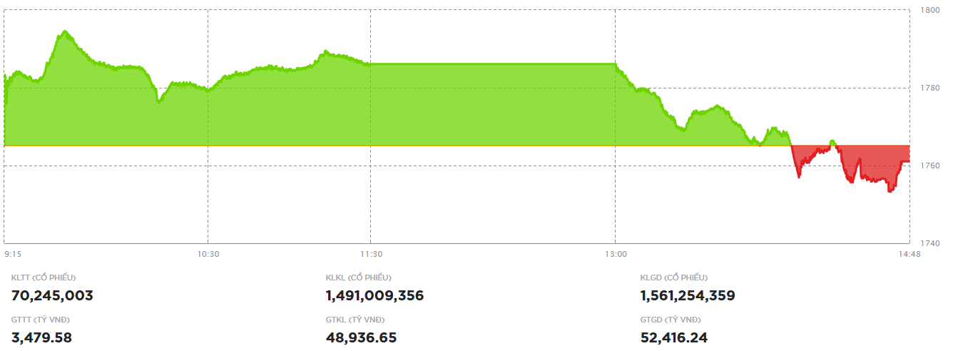 Chốt phiên, sàn HOSE có 76 mã tăng và 256 mã giảm, VN-Index giảm 4,06 điểm (-0,23%), xuống 1.761,06 điểm. Tổng khối lượng giao dịch đạt hơn 1,56 tỷ đơn vị, giá trị 52.416,2 tỷ đồng, tăng hơn 17% về khối lượng và 18% về giá trị so với phiên hôm qua. Giao dịch thỏa thuận đóng góp hơn 90,4 triệu đơn vị, giá trị 5.352 tỷ đồng, trong đó, đóng góp lớn từ hơn 16,81 triệu cổ phiếu VIC, trị giá hơn 3.028 tỷ đồng.