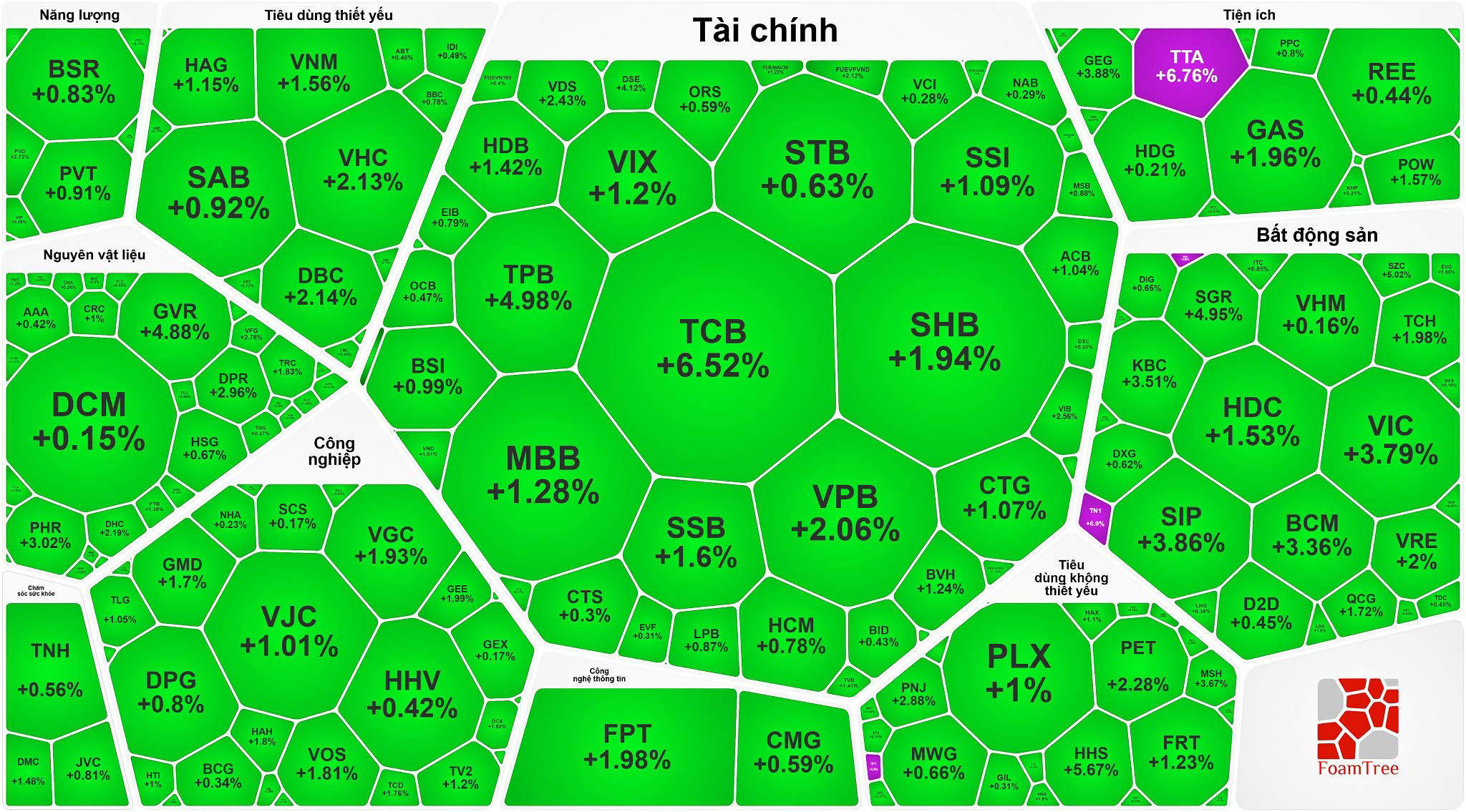 Nhóm cổ phiếu tài chính (ngân hàng và chứng khoán) nghiêng về sắc xanh. Trong đó, nhóm cổ phiếu ngân hàng tiếp tục tăng mạnh: CTG tăng 4,1%, BVB tăng 4,13%, MBB tăng 2,94%, VPB tăng 2,02%, BID tăng 1,56%, EIB tăng 2,34%...