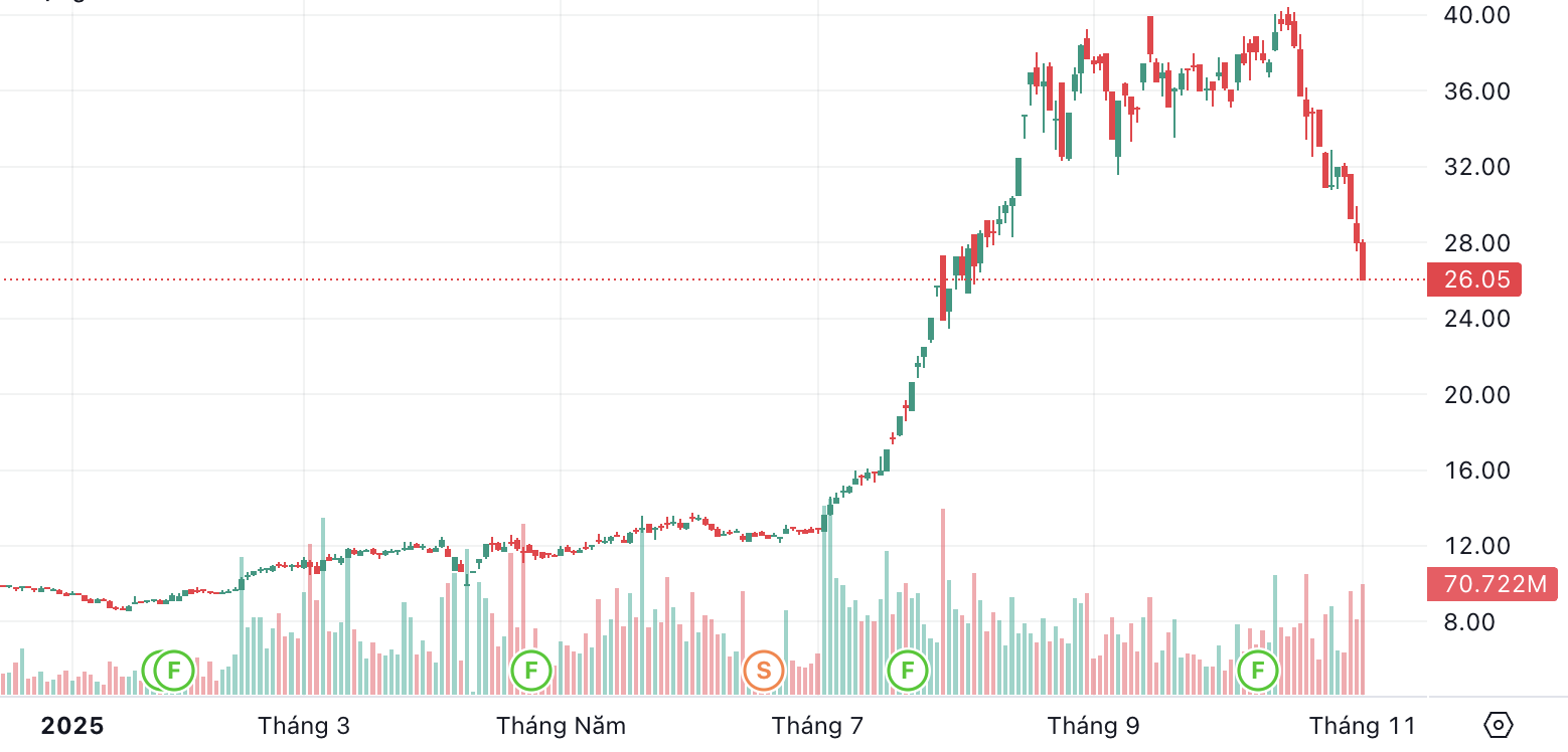 Đến phiên 15/10, cổ phiếu này chính thức đạt đỉnh lịch sử tính theo giá đóng cửa: 39.600 đồng/cổ phiếu. Còn nếu tính theo mức giá cao nhất đạt được, có lúc VIX đã chạm được ngưỡng 40.450 điểm trong phiên 16/10. Và từ đó đến nay, giá VIX quay đầu giảm không phanh.