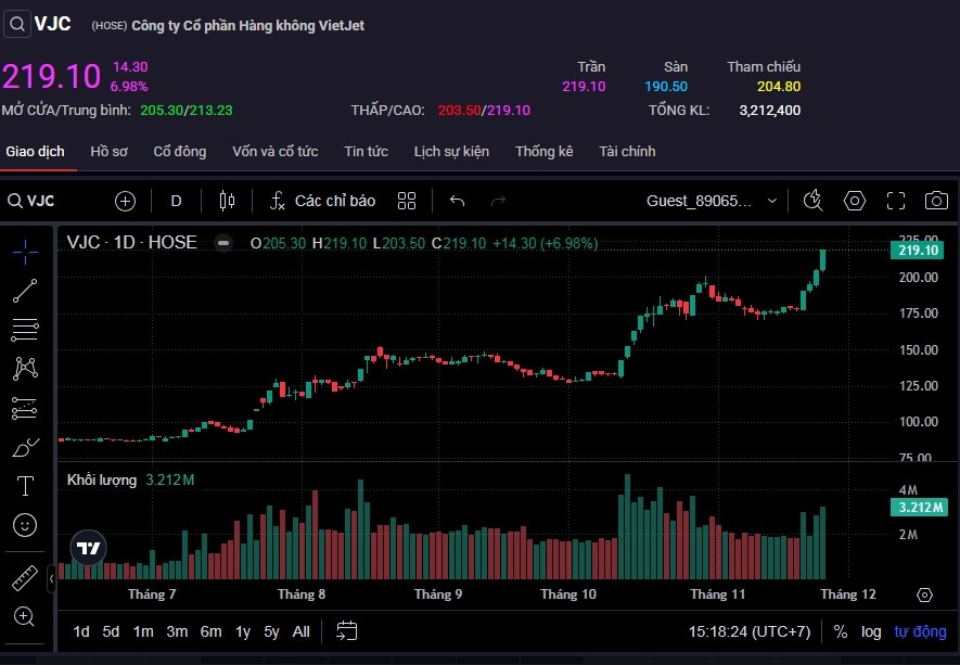 Cổ phiếu VJC tăng trần trong phiên 25/11, lập đỉnh mới.