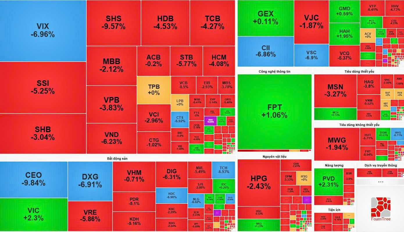 Áp lực điều chỉnh mạnh nhất đến từ nhóm ngân hàng, khiến thị trường rung lắc trong suốt phiên. Các mã giảm sâu gồm TCB (-4,27%), STB (-5,77%), VPB (-3,83%), HDB (-4,53%), MBB (-2,12%), SHB (-3,04%), khiến VN-Index mất khoảng 12 điểm.