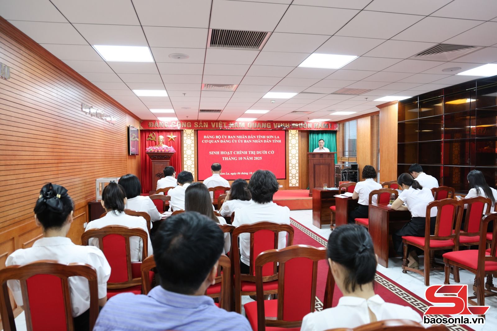 Tại buổi sinh hoạt, toàn thể cán bộ đảng viên, người lao động cơ quan Đảng ủy UBND tỉnh đã thực hiện nghi thức chào cờ Tổ quốc, hát Quốc ca. Đồng thời, các đại biểu được thông tin các nhiệm vụ trọng tâm của Cơ quan Đảng ủy UBND tỉnh tháng 10/2025; nghe bài viết “Tư tưởng của Bác đối với công tác kiểm tra, giám sát của Đảng”.