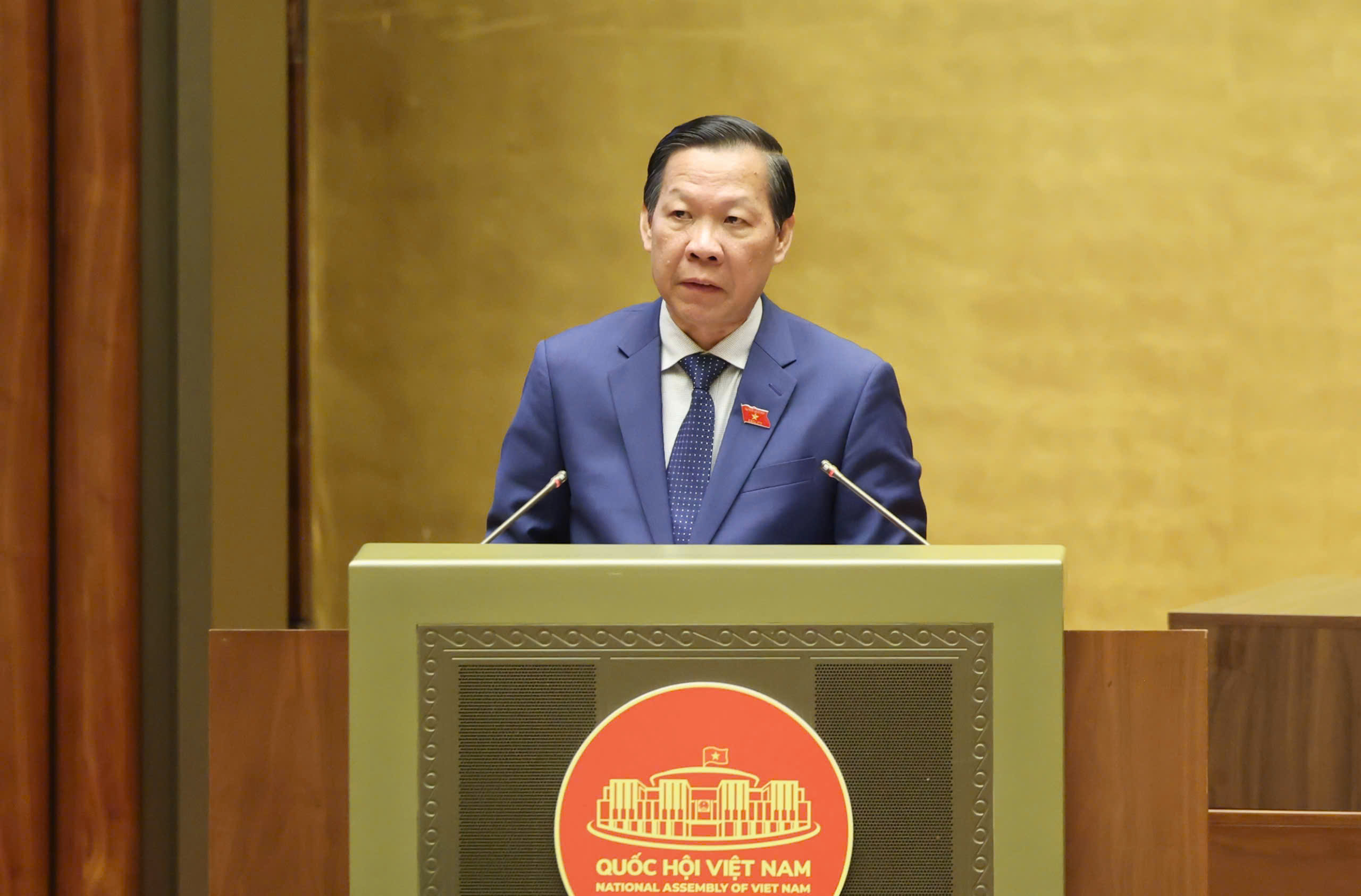 Chủ nhiệm Ủy ban Kinh tế và Tài chính Phan Văn Mãi trình bày báo cáo thẩm tra dự thảo Nghị quyết của Quốc hội. Ảnh: QUANG PHÚC