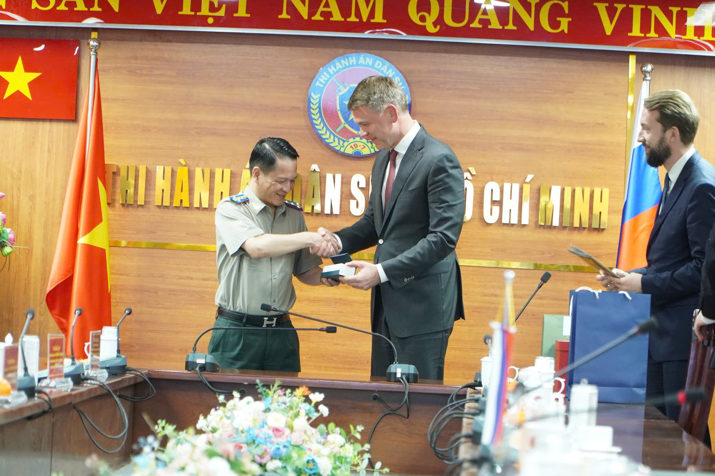 Trưởng THADS TPHCM Nguyễn Văn Hòa và ông Dmitry Aristov - Giám đốc Cơ quan Thi hành án Liên Bang Nga. Ảnh: Cẩm Tú