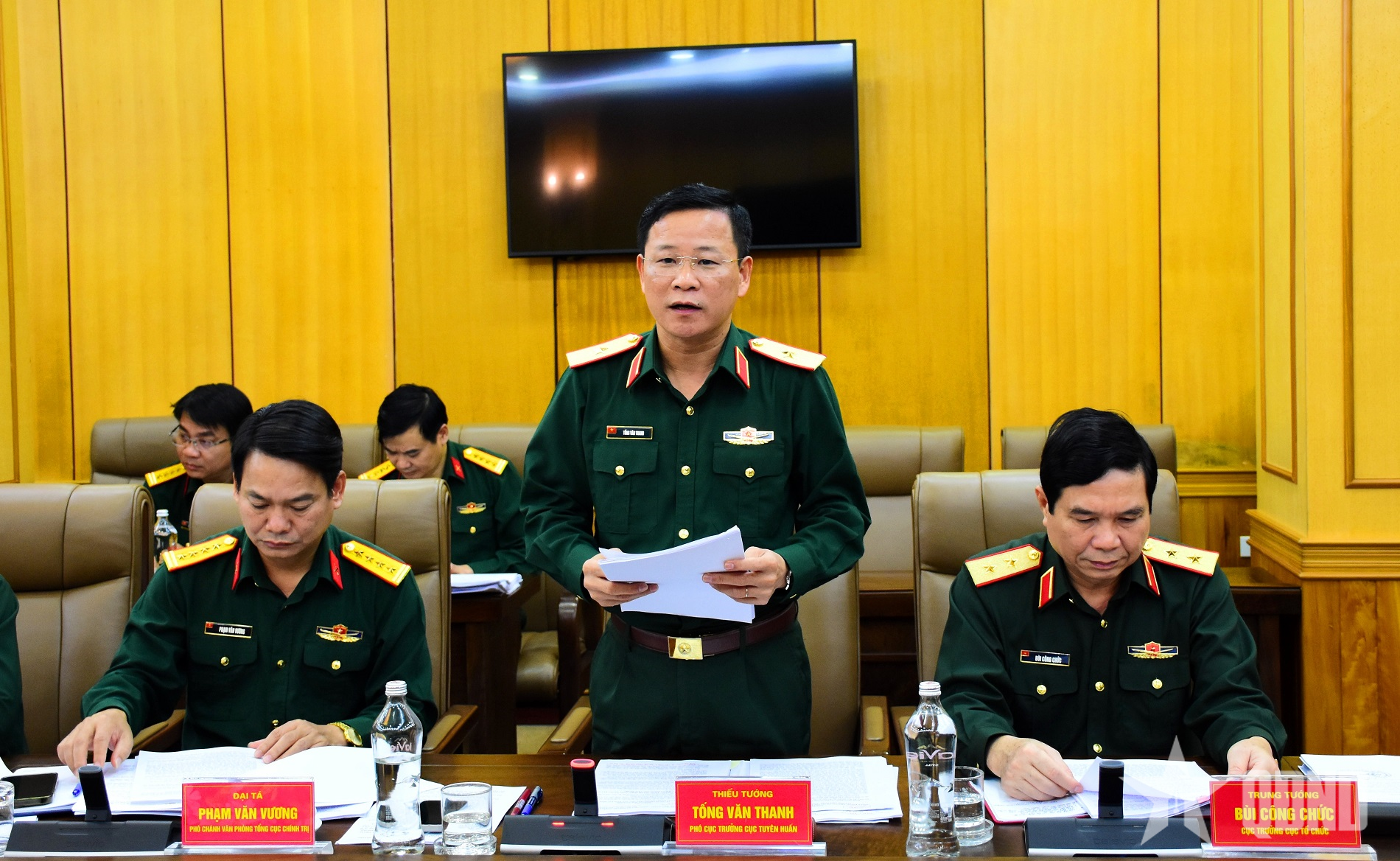 Thiếu tướng Tống Văn Thanh, Phó cục trưởng Cục Tuyên huấn trình bày dự thảo báo cáo tại phiên họp.