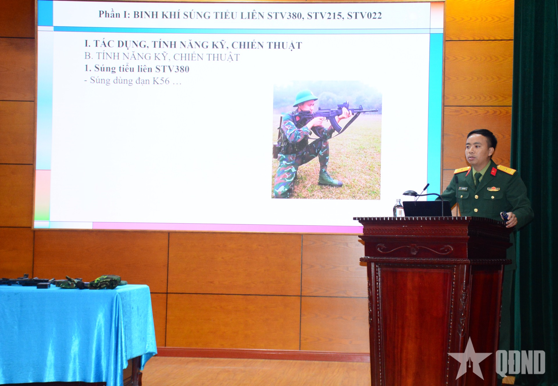 Giáo viên giới thiệu tính năng, kỹ - chiến thuật và đặc điểm, cấu tạo chung của súng tiểu liên STV-380.