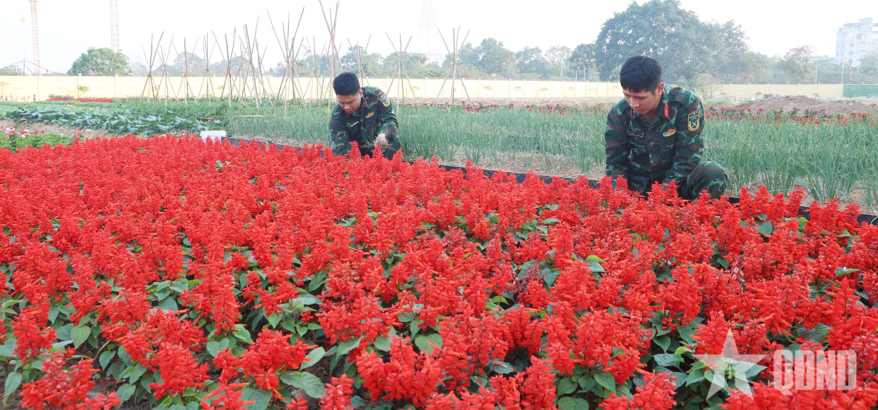 Chiến sĩ chăm sóc vườn hoa.