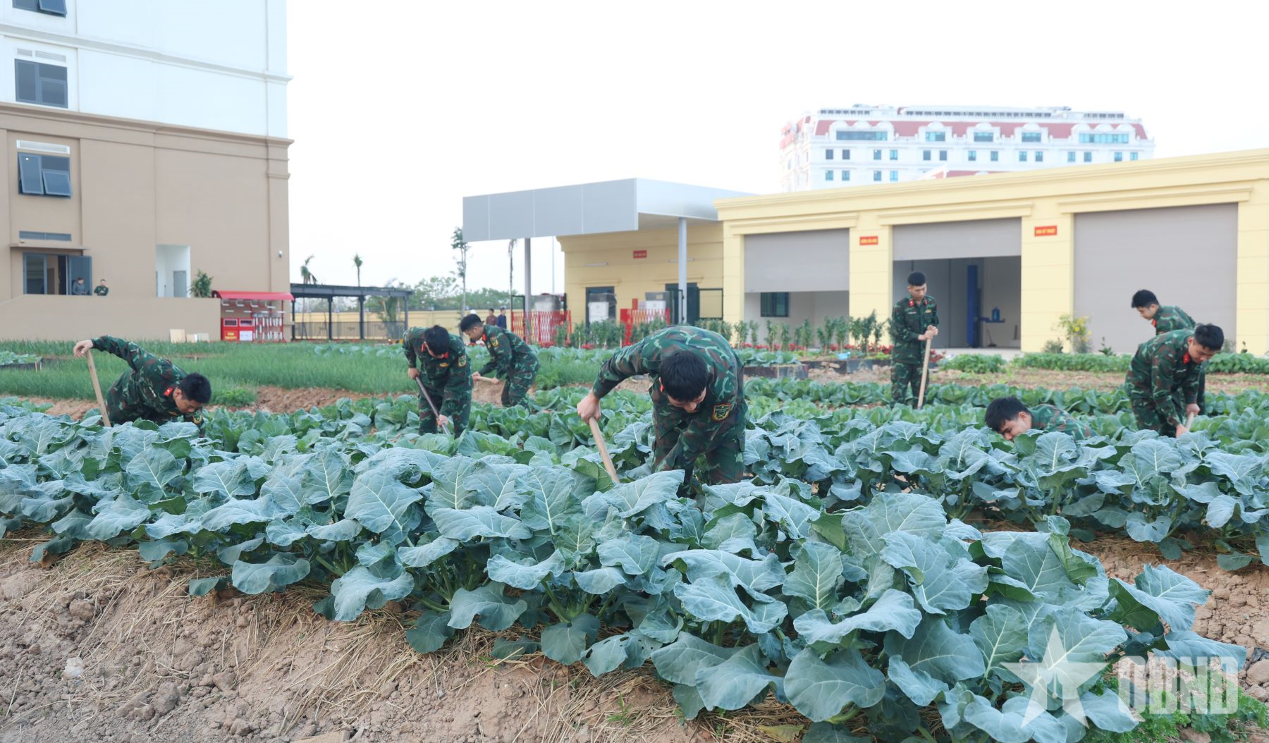 Các chiến sĩ chăm sóc vườn rau sạch.