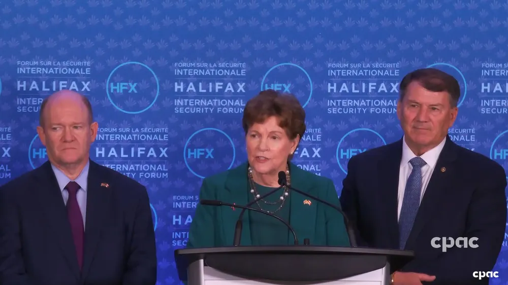 Các thượng nghị sĩ Mỹ Jeanne Shaheen (giữa), Chris Coons (trái) và Mike Rounds (phải) tại Diễn đàn An ninh quốc tế Halifax (Canada) hôm 22-11. Ảnh chụp màn hình: CPAC